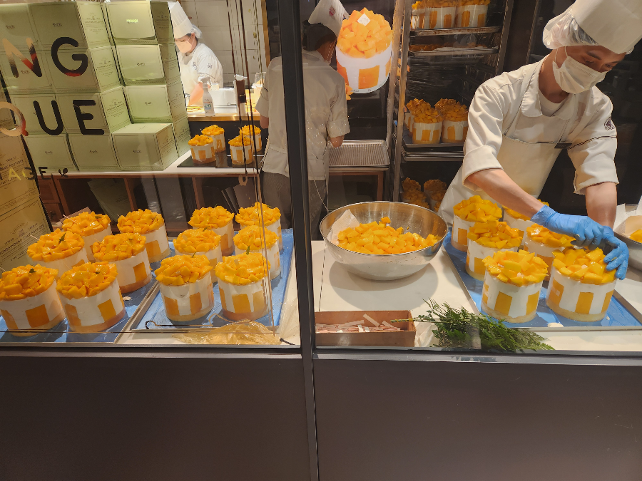 오전8시, 1층 매장의 문이 열리면 줄을 따라 지하1층 망고시루 전용매장으로 내려갑니다